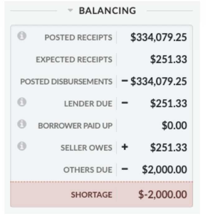 The Balancing section shows all posted and expected receipts, and posted and pending disbursements. This is broken down by what is owed by – or due to – the Lender, Borrower, Seller, and all Others.