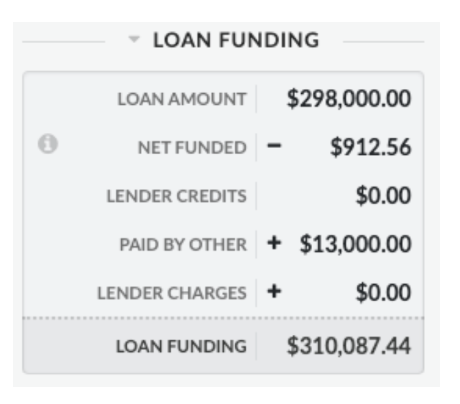 If your loan funds are off, you may have too many or too few charges marked as Net Funded. Hover over the i to view which items have been marked net funded. You should also confirm that any credits or additional